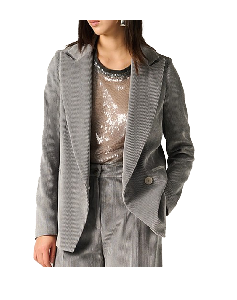 Blazer di Manila Grace, realizzato in velluto a costine leggermente elasticizzato . Il taglio sartoriale con chiusura monopetto lo rende versatile, da abbinare su pantaloni più o meno sportivi o in sovrapposizione ad abiti. Composizione tessuto : 86% POLIESTERE, 12% POLIAMMIDE, 2% ELASTAN.