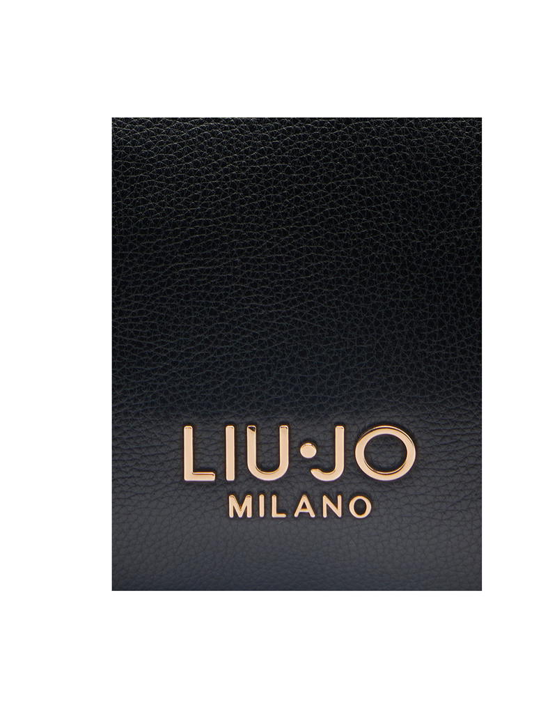 Borsa in eco pelle con effetto bottalato e logo lettering metallico applicato sul davanti. Presenta doppi manici con borchie e tracolla removibile e regolabile in lunghezza. Lo scomparto centrale , rifinito con fodera logata , è chiuso superiormente da zip. Misure: 25 x 15 x 17 cm.
