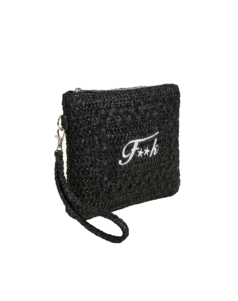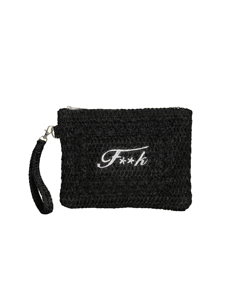 Mini pochette in rafia di dimensioni 23 X 18 cm chiusa superiormente da zip e dotata di laccetto da polso removibile. Logo ricamato frontale.