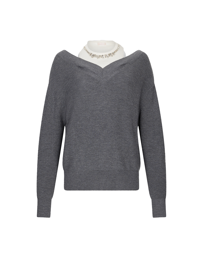 Maglia Donna effetto sovrapposto, realizzata in misto lana. Dotata di uno scollo a V e di una canotta sottostante non rimovibile, con scollatura girocollo e detttaglio gioiello. Una maglia a maniche lunghe perfetta per essere abbinata ad un pantalone chino e ad un paio di ballerine.