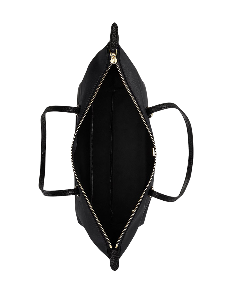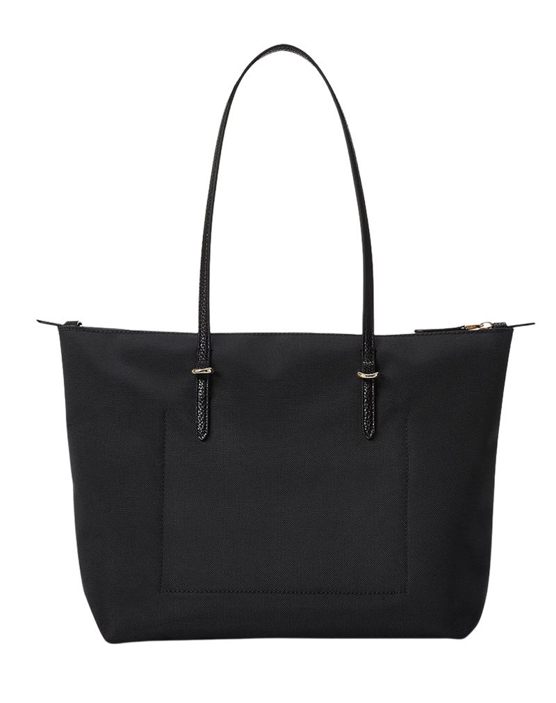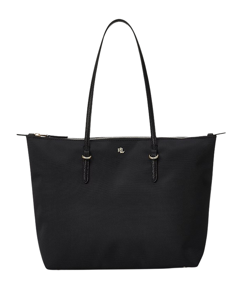 Borsa donna in resistente nylon con manici a spalla e rifiniture in pelle ecologica color nero. Zip superiore dorata e piccolo logo LRL sul davanti. Ampio spazio interno con piccola taschina porta oggetti. Misure:26,7 cm A x 38,1 cm L x 14 cm P
