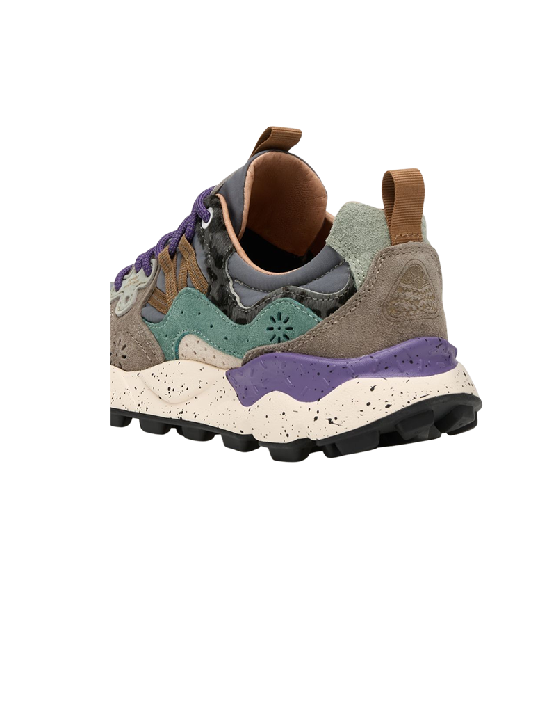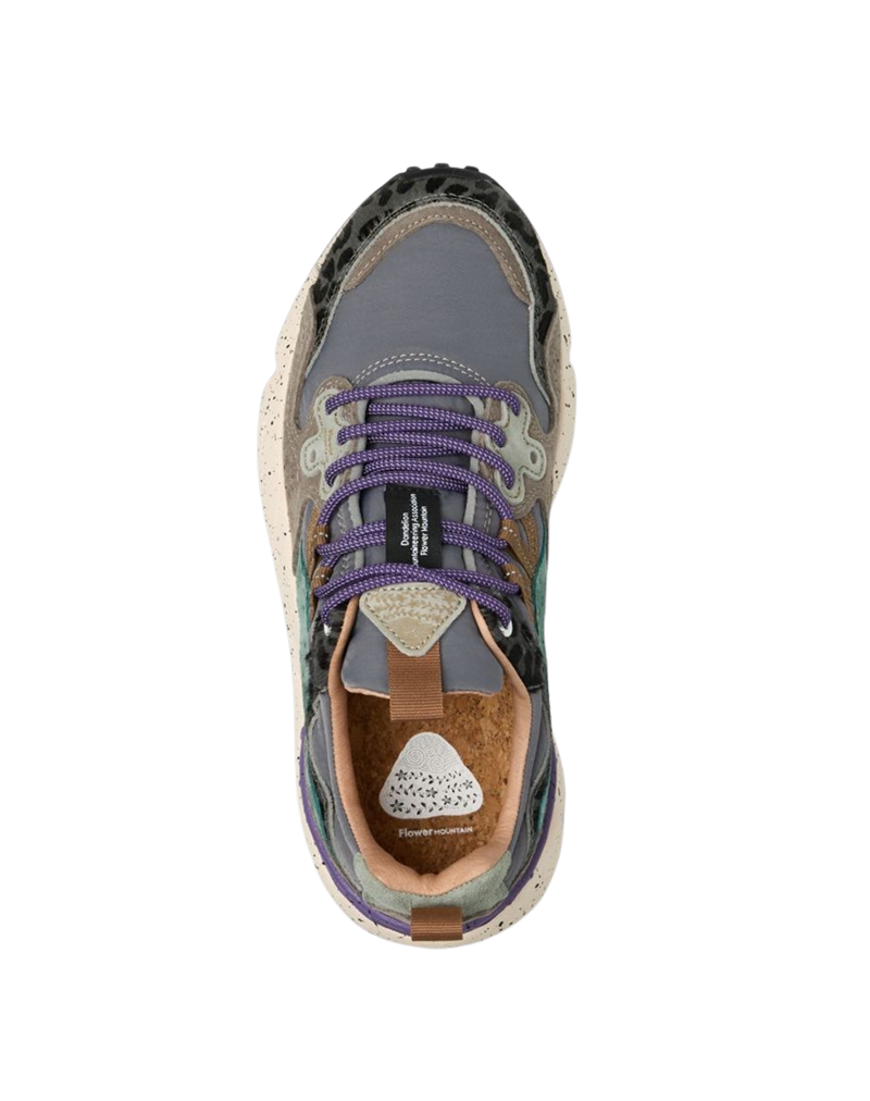 La Sneakers Donna, modello Yamano 3, è realizzata con una tomaia in tessuto tecnico leggero ed inserti in suede, tra cui alcuni con motivo animalier. La chiusura con lacci ed occhielli rinforzati rimanda ad una scarpa da trekking, ma con un design più moderno. La soletta interna in sughero naturale è anatomica, mentre la suola in gomma ultraleggera la rende ideale per ogni tipo di terreno. Una sneakers perfetta per un look casual o sportivo.