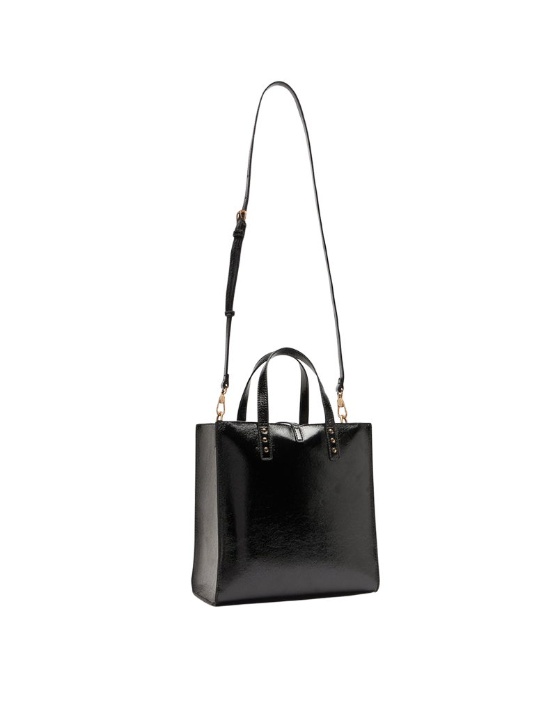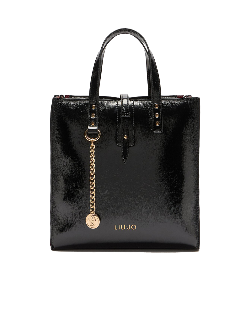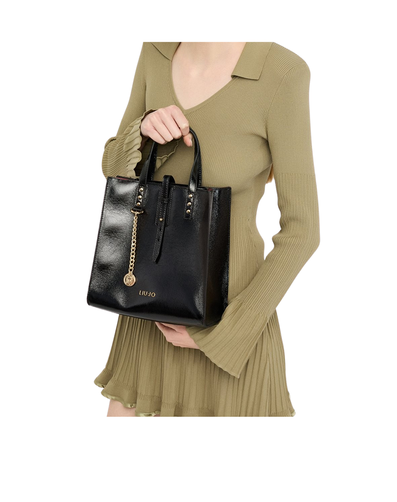 Borsa a mano lucida ,con dotazione di tracolla rimovibile e regolabile in lunghezza, in simil pelle effetto lucido. Mini borchie applicate e logo in metallo color oro. Charm logato con catena . Misure: 25 x 14 x 26 cm.
