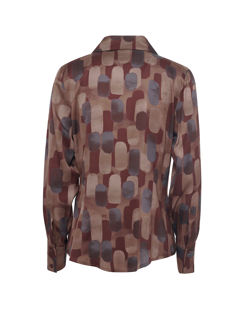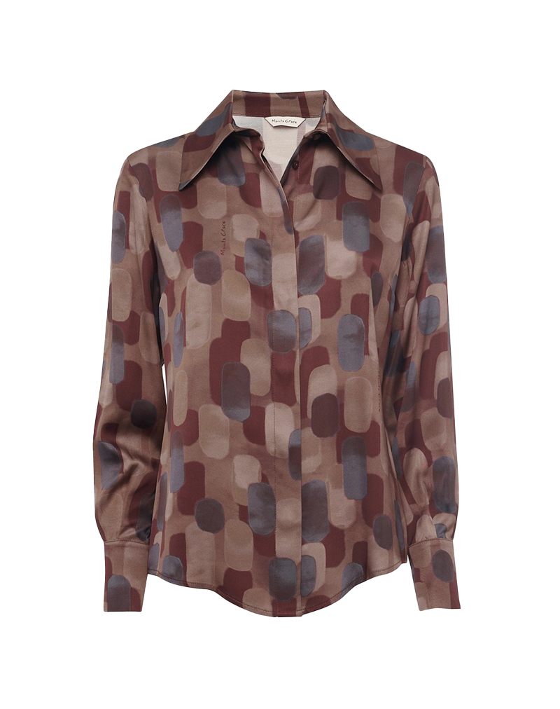 Camicia donna in 100% viscosa con fantasia geometrica all over. I caldi colori sulle tonalità del marrone e blu grigio permettono di abbinarla con vari look e la stampa particolare ma sobria la rende un capo elegante da adattare con out fit giornalieri o serali.