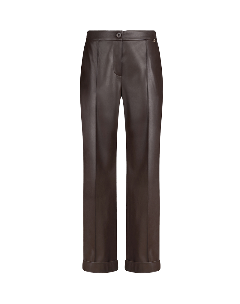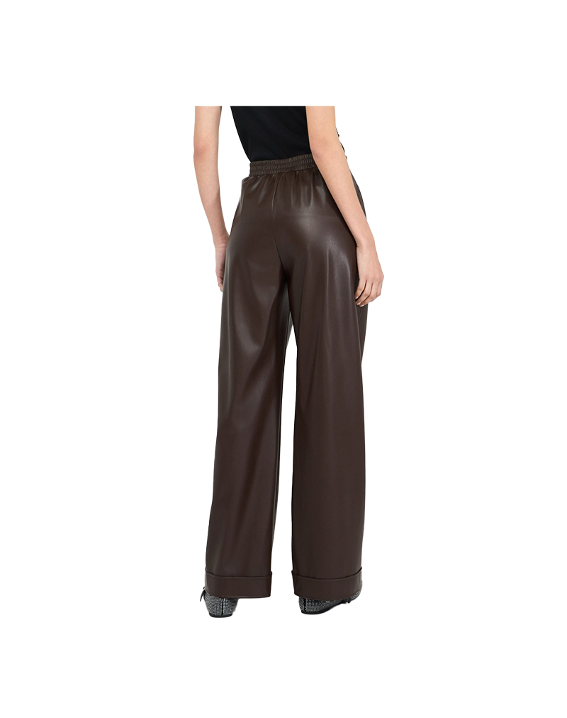 Pantaloni donna in tessuto spalmato effetto simil pelle con elastico posteriore in vita , gamba dritta con risvolto sul fondo. Composizione tessuto 100% poliestere. La modella alta 177 cm indossa mis. 40.