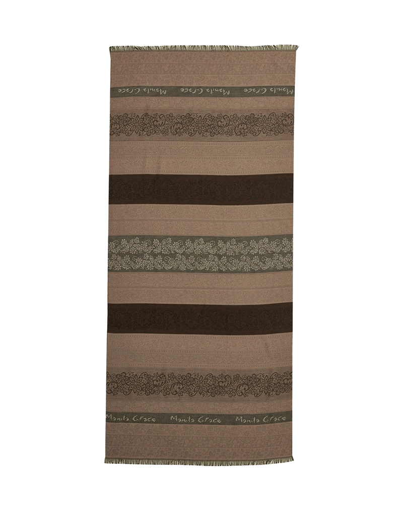 Maxi sciarpa a righe con motivo jacquard sui toni del marrone . Impreziosita dalle mini frange laterali che completano l'estetica di questo capo , morbido e caldo , da indossare sui tuoi vari outfit più o meno giornalieri. Misure 80x180 cm . Composizione tessuto: 58% POLIESTERE, 37% PC (POLICLORURO), 5% VISCOSA.