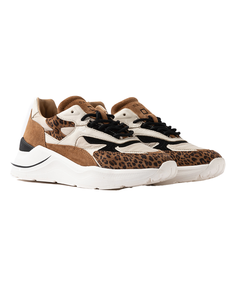Sneakers donna running in nylon beige e suede cuoio con stampa animalier. Dettagli in suede colore nero e pelle colore avorio. Fodera in pelle e spugna di cotone.Suola in gomma blowtech gum alta 2 - 3.5 cm.Tutti i pellami selezionati sono Made in Italy.Vestibilità: REGULAR.