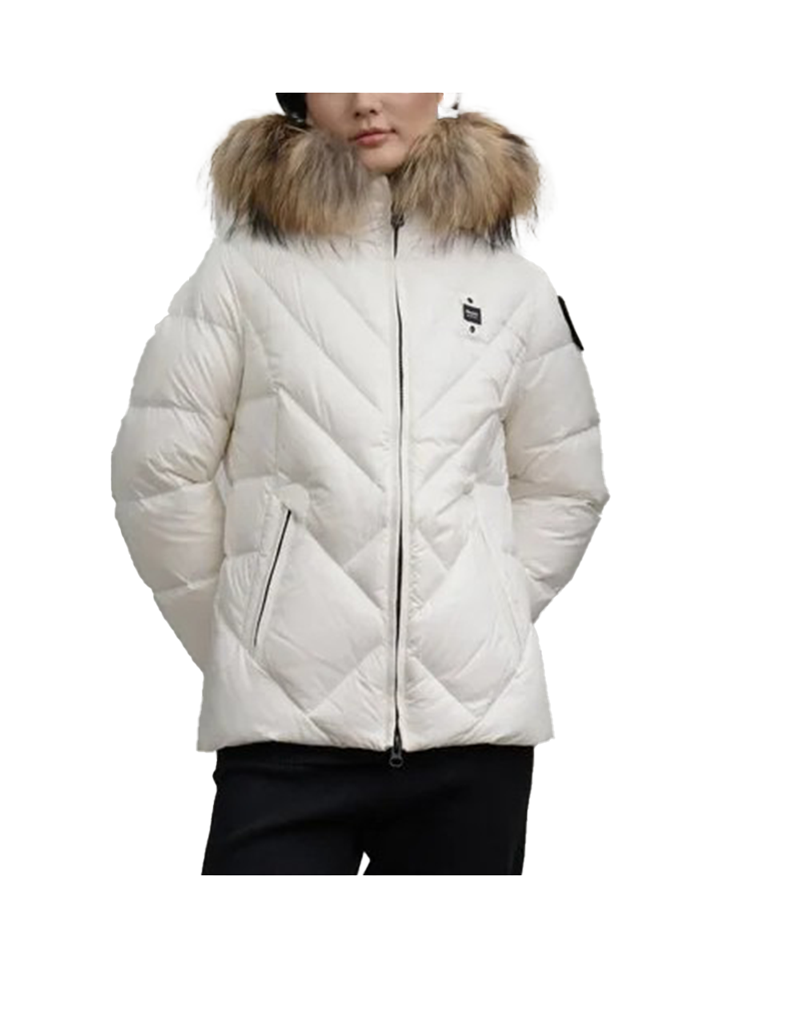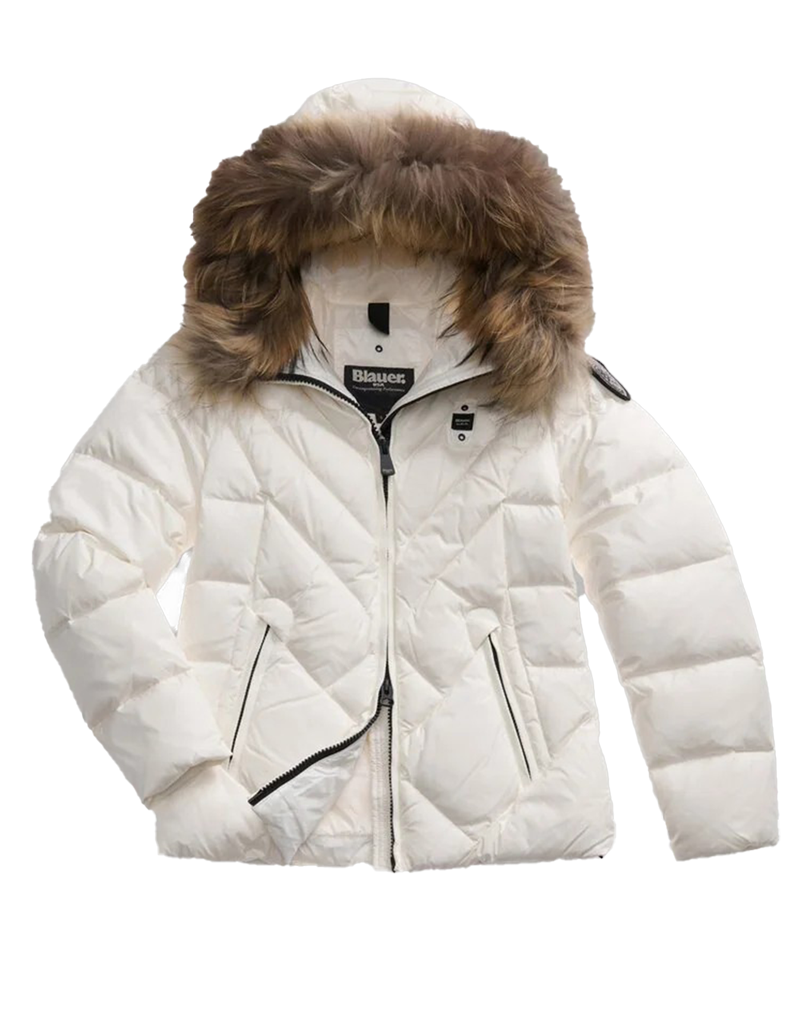 Giubbino donna trapuntato con imbottitura in vera piuma 90/10 gr.255 . Taglio leggermente avvitato per far risaltare la figura. Cappuccio fisso con bordatura in vera pelliccia removibile. Chiusura con zip nascosta. Tasche con zip. Tasche interne con velcro e zip. Coulisse sul fondo. Patch glitterato e passante con logo.