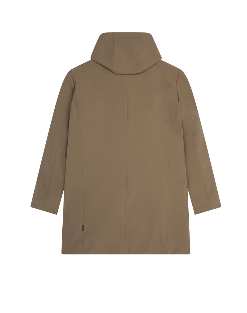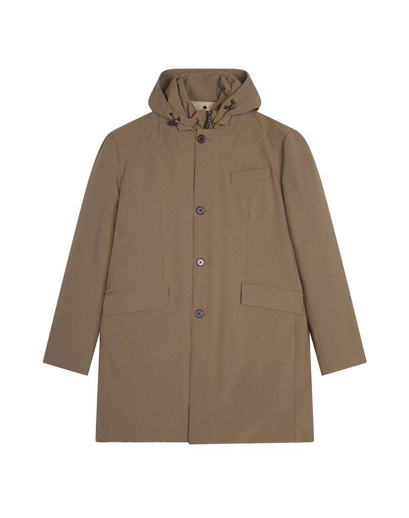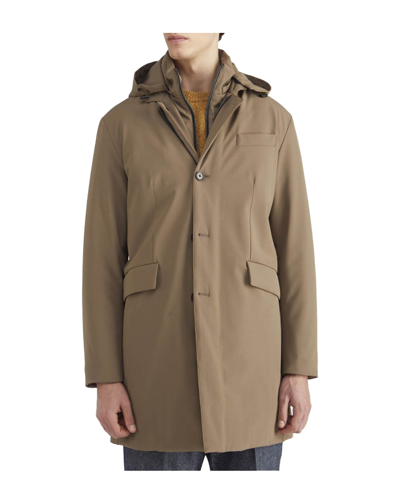 Giubbotto uomo in tessuto tecnico leggermente elasticizzato, dalla lunghezza intermedia , ideale per affrontare le giornate fredde e piovose in tutta comodità. Il cappuccio e la pettorina interna staccabili così come la doppia abbottonatura con bottoni e zip lo rendono un capo che si adatta facilmente alle varie esigenze .A rifinire il tutto un taschino sul petto e due tasche con pattina.