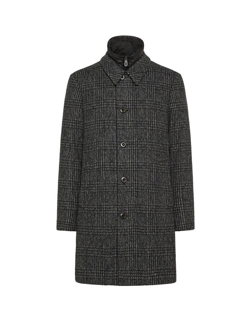 Cappotto uomo in misto lana con fantasia a quadri chiuso anteriormente da bottoni ,con collo camicia. L'eleganza di questo capo della linea Peuterey Première , è impreziosita dalla presenza di una pettorina con imbottitura sintetica e removibile, che gli garantisce un utilizzo versatile e pratico. Composizione: 50% lana 45% poliestere 5% altre fibre . Vestibilità regolare.