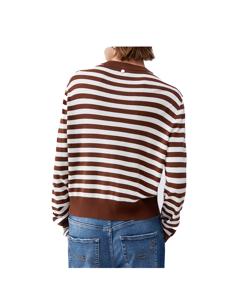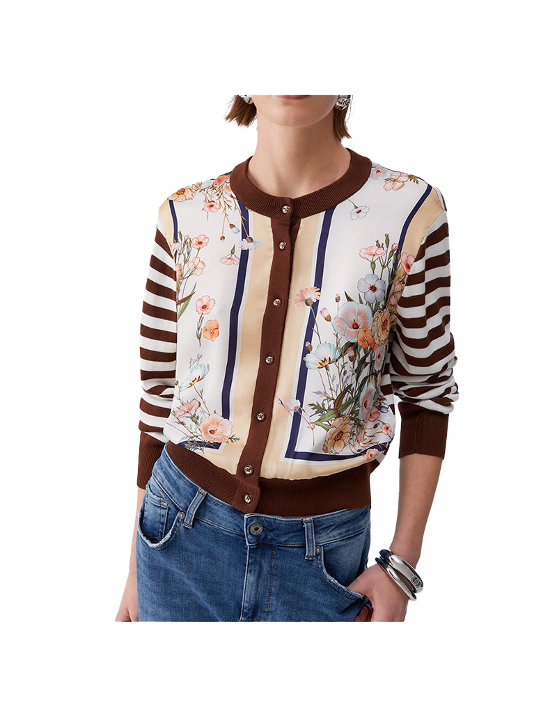 Cardigan in maglia della linea Liu Jo Better con filato in misto viscosa con fantasia a righe nella parte posteriore e sulle maniche e inserto in twill stampato sul davanti . Chiuso anteriormente da bottoni a pressione . La modella indossa misura S.
