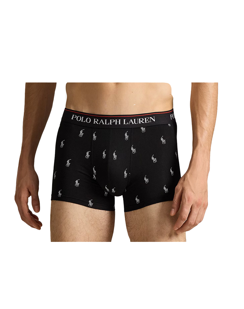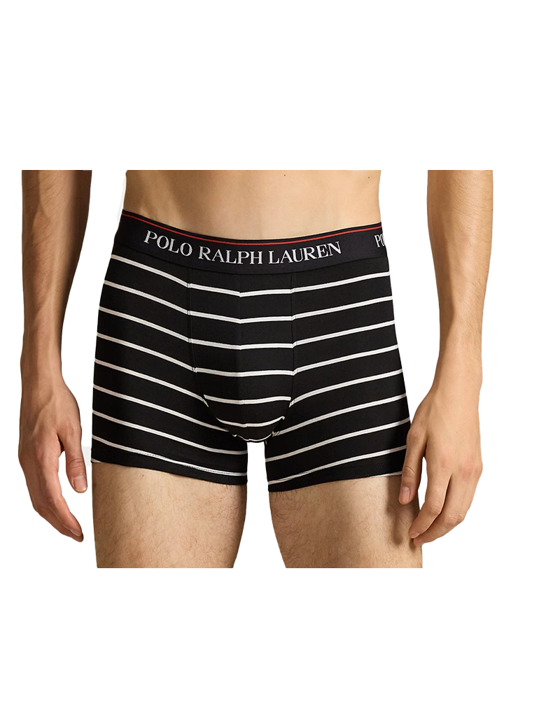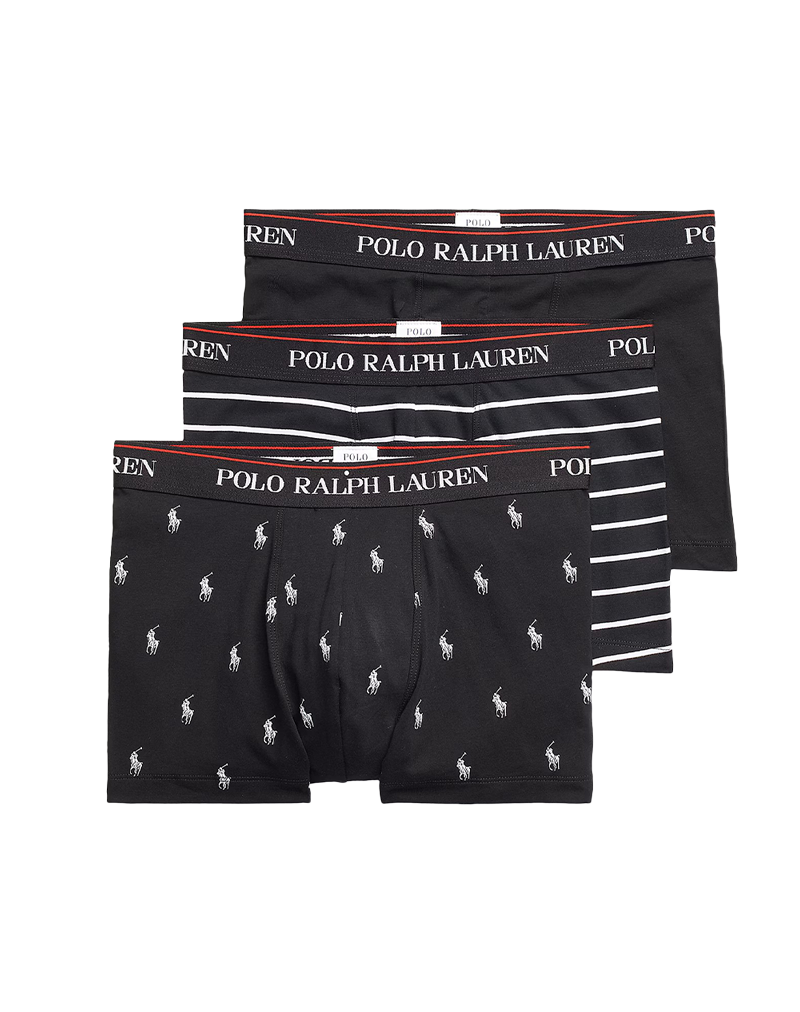 Confezione da 3 paia di boxer uomo con tasca ergonomica e tessuto in cotone elasticizzato per una vestibilità ottimale. La confezione include boxer tinta unita nero, boxer fantasia riga fondo nero e logo all over fondo nero. L' elastico con scritta POLO RALPH LAUREN rifinisce il tutto . Composizione tessuto 95% cotone 5% elastan.