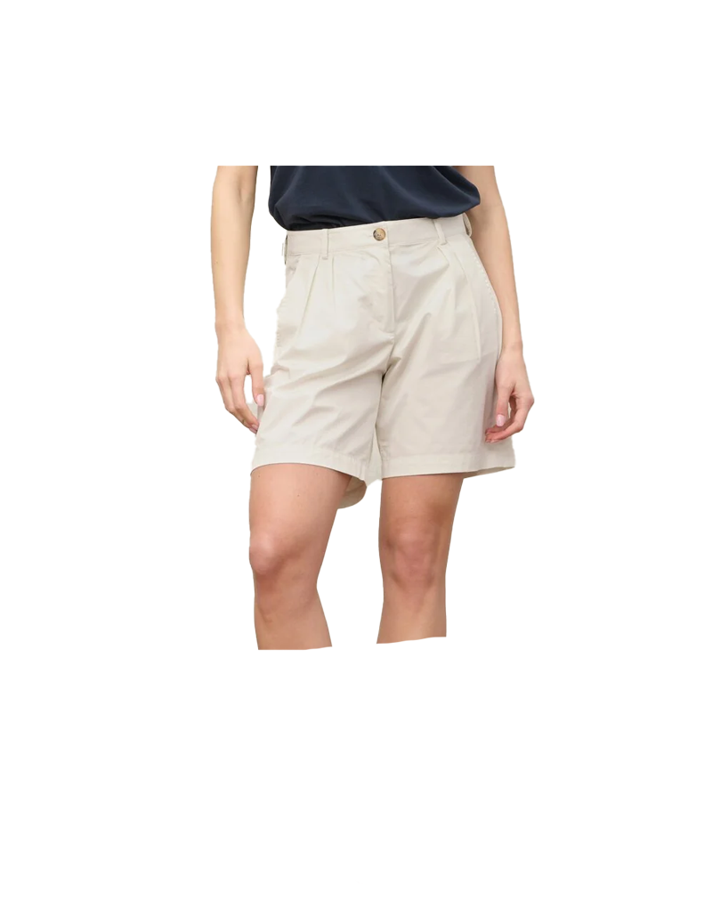 Pantaloncino da donna in 100% cotone con pences sul davanti e quattro tasche davanti e dietro. La vestibilità super classica leggermente svasata sul fondo con passante per cintura , lo rende un capo estremamente classico da utilizzare su tutti i tuoi outfit casual durante le calde giornate estive.