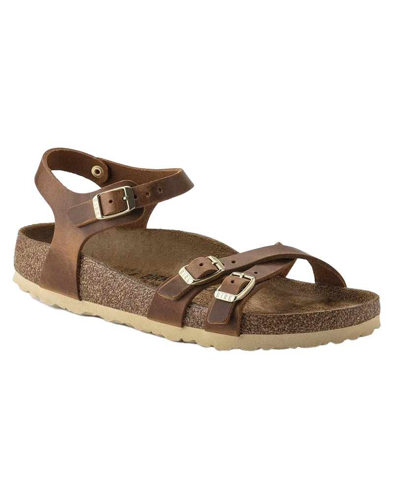 Per affrontare le tue estati in tutta comodità e stile , Birkenstock ti propone il sandalo Kumba , in pregiata pelle nabuk particolarmente spessa e oliata. La tomaia ,con doppio cinturino incrociato davanti e cinturino alla caviglia per sostenere bene il piede , permette una calzata ottimale grazie alle tre fibbie che ne regolano l' ampiezza. Immancabile il plantare anatomico con soletta in pelle scamosciata. Calzata stretta.