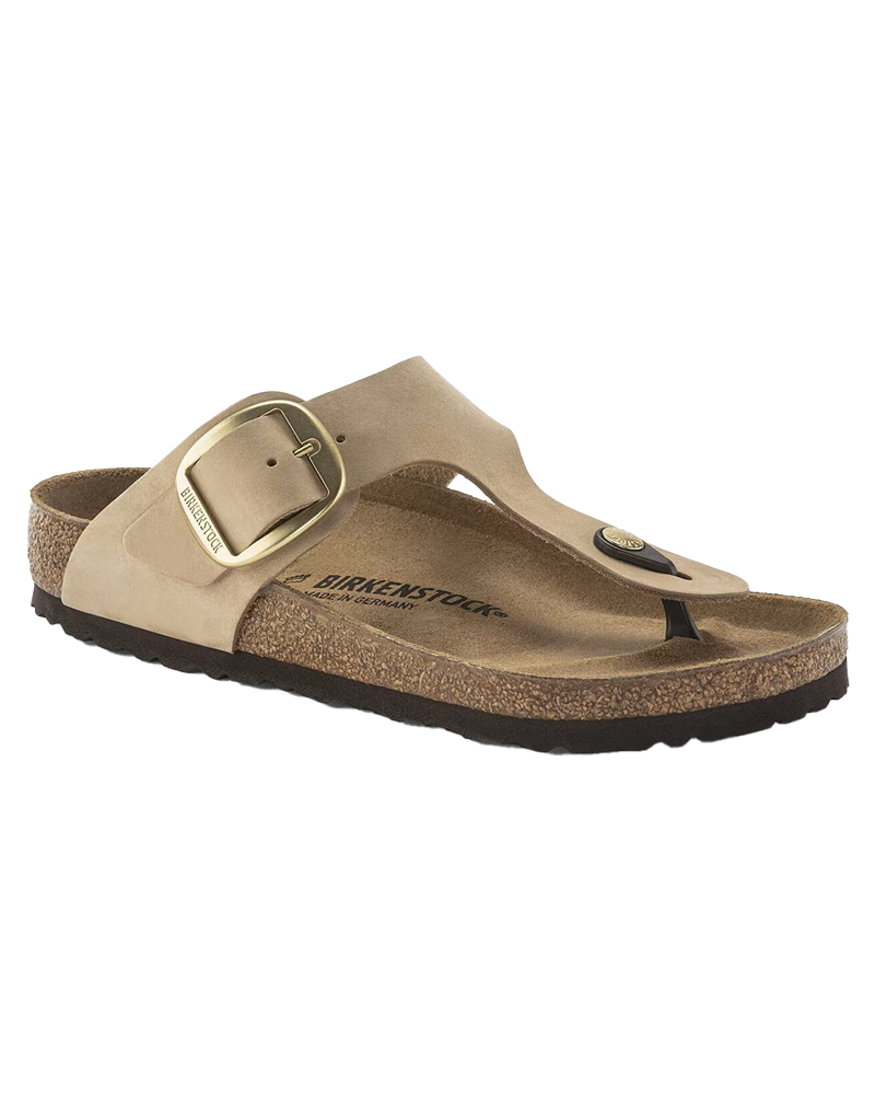 Storico modello Gizeh di Birkenstock presentato con tomaia in preziosa pelle nabuk su plantare anatomico in sughero e lattice foderato in pelle scamosciata. Dettagli preziosi come la fibbia metallica grande color oro e il tassellino infradito in contrasto di colore con la tomaia , rendono questa scarpa infradito adatta per affrontare l' estate con stile ma in totale comodità. Pianta normale. Suola in EVA.