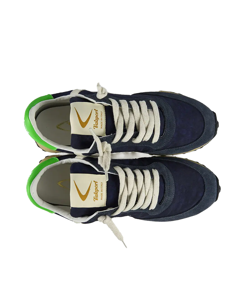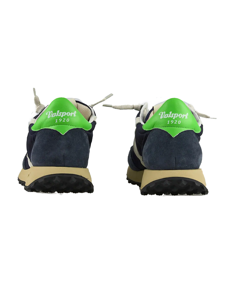 Sneakers da uomo con tomaia in nylon e suede foderata in pelle con materiali italiani altamente selezionati e ,come nella migliore tradizione Valsport , lavorati da esperti artigiani. Boomerang e backtab in pelle. Suola in gomma di concezione running con battistrada nero. Calzata comoda.