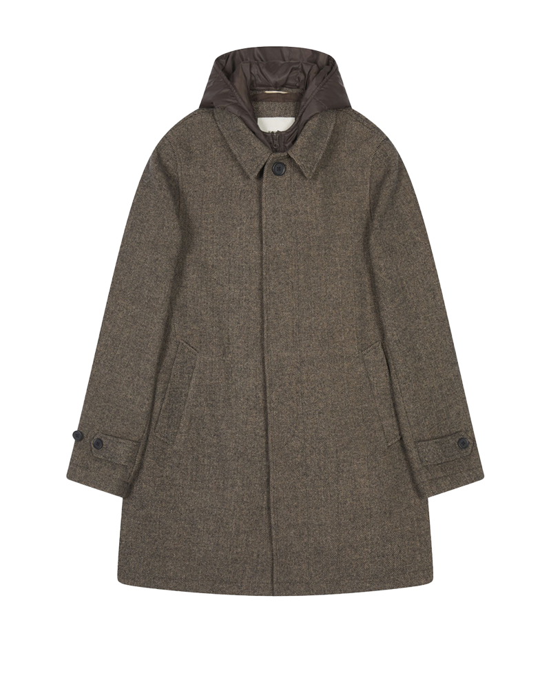 Cappotto monopetto in tessuto spigato completamente foderato ideale per affrontare l'inverno con praticità e stile. Si caratterizza e si distingue grazie ad una pettorina e un cappuccio in nylon staccabili. La chiusura frontale nascosta,le tasche a filetto sul davanti, i polsi con bottone e lo spacco centrale sul retro rifiniscono il tutto, rendendo questo capo super versatile . Composizione: 30% Lana 70% Fibre Artificiali.