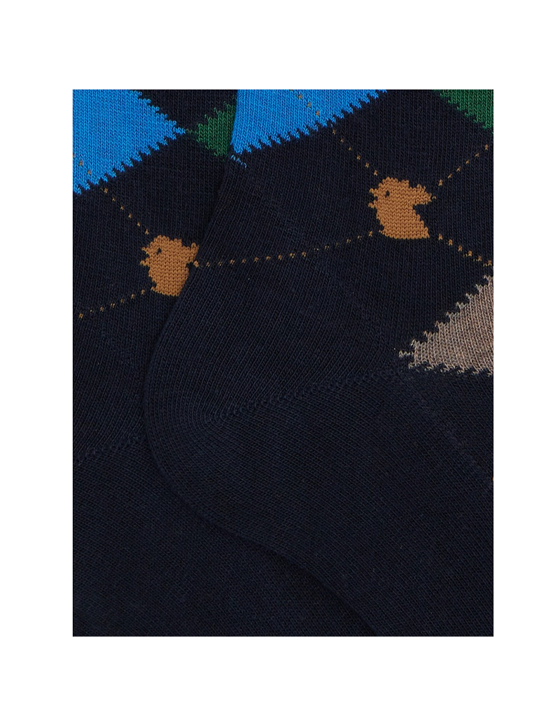 Iconico calzino uomo proposto nella fantasia intarsia con fondo blu . Il morbidissimo caldo cotone , lo rende ideale per affrontare l'inverno senza rinunciare allo stile. Composizione 78% Cotone 20% Poliammide 2% Elastan. Misura unica 40/45. Made in Italy.
