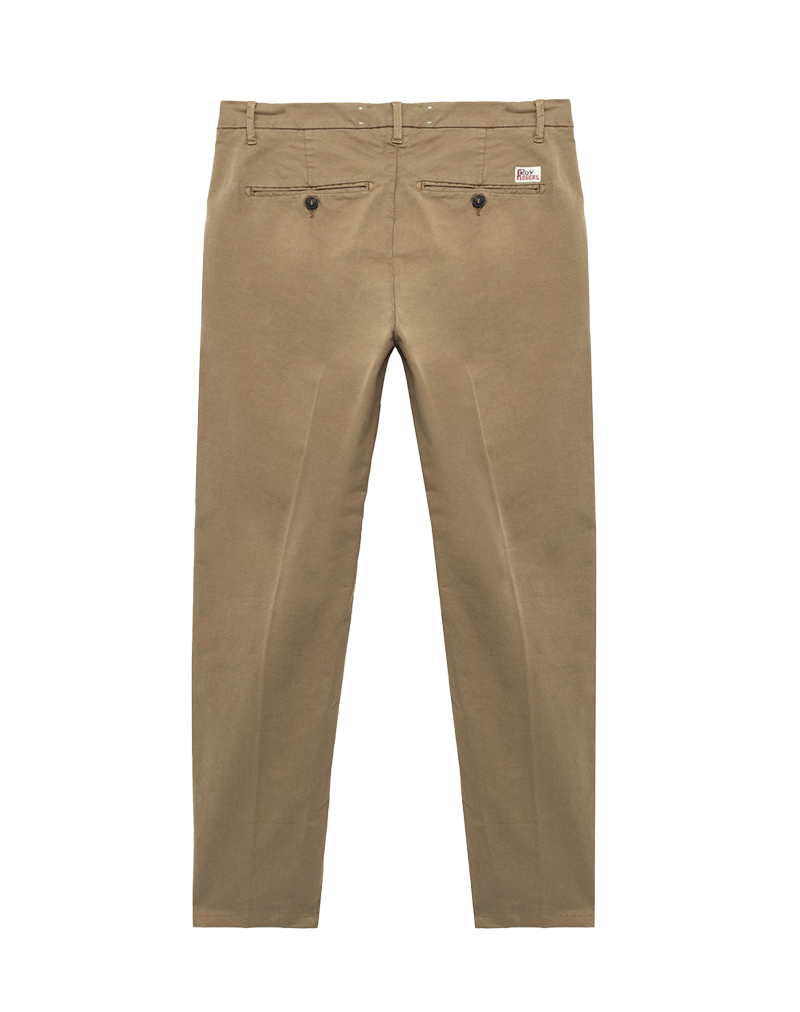 Iconico pantalone di Roy Rogers il New Rolf in versione estiva si presenta in leggera gabardina leggermente elasticizzata. Il taglio Chino con tasche all'americana sul davanti e taschine a filo con bottoni dietro si accompagna ad una vita media e al Label Roy Roger's applicata sul retro. Slim fit.