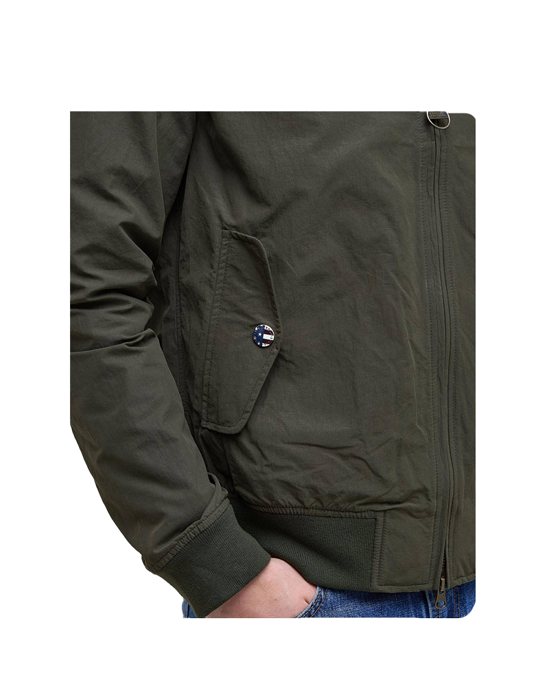 Giubbino uomo della collezione Barbour International ispirato allintramontabile modello Harrington. Chiuso anteriormente da zip, presenta due tasche chiuse da patta con bottoni e un colletto foderato in microcosta di velluto. Il bordo inferiore e i polsini gli conferiscono una vestibilità asciutta . Iconico il patch ricamato sulla spalla Steve Mcqueen in tonalità di colore. Ideale per la mezza stagione .