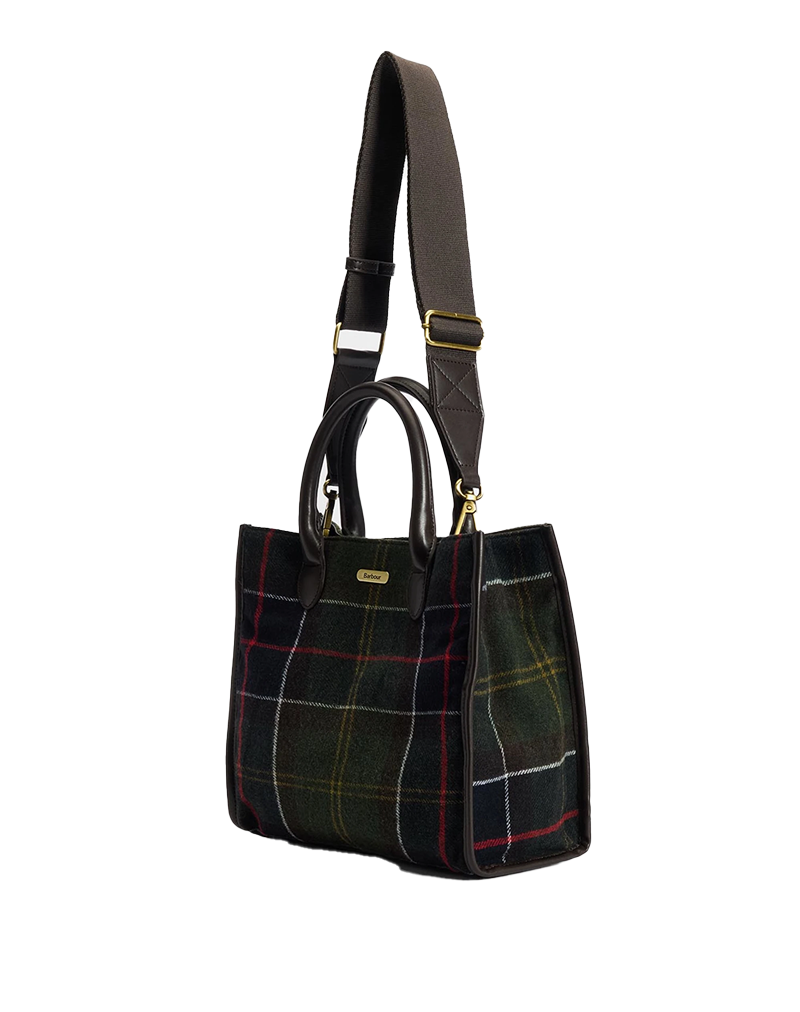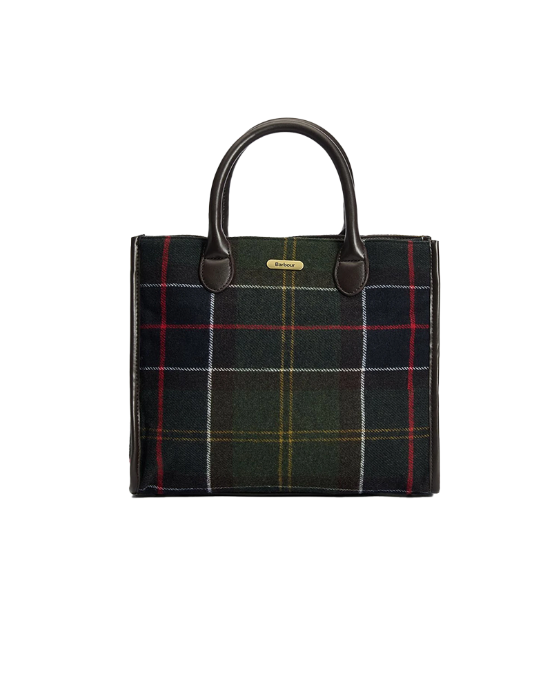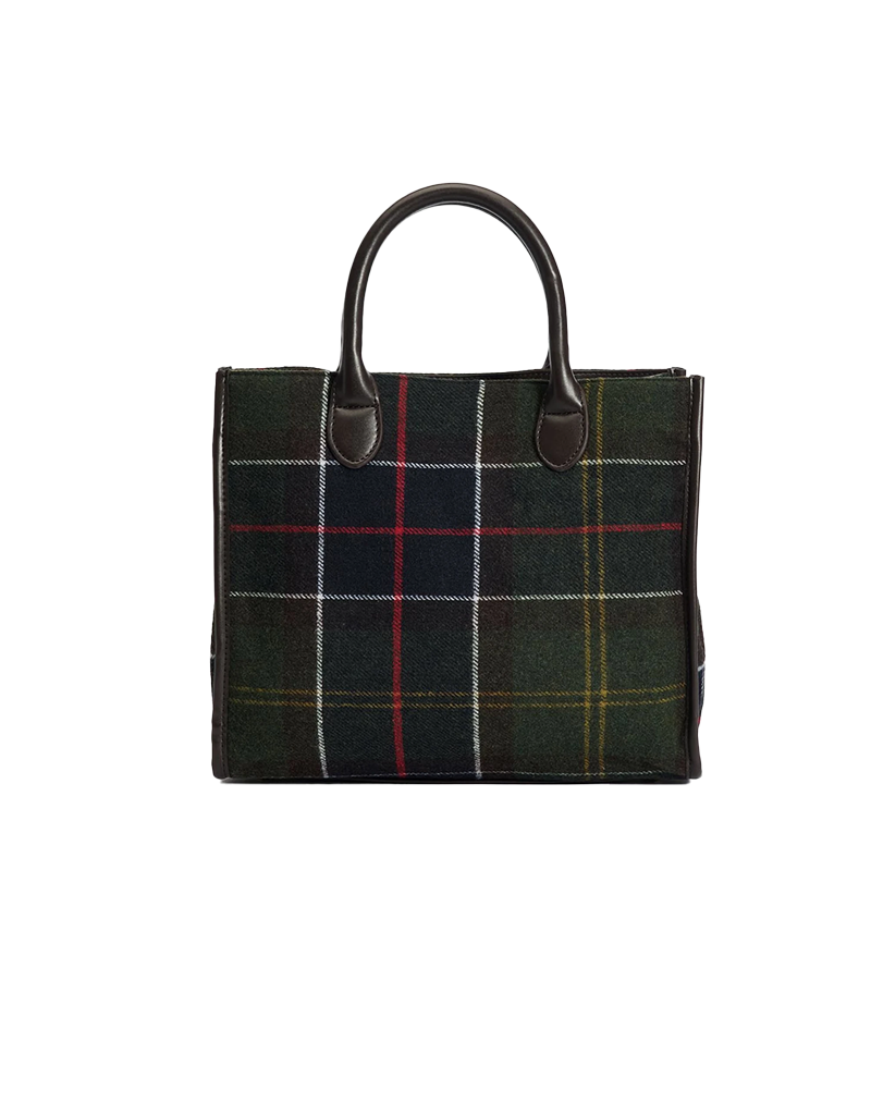 Borsa di dimensioni medie con doppio manico e tracolla in tessuto rimovibile e regolabile in lunghezza. Classico Tartan di Barbour in misto lana con finiture in simil pelle. Chiusa superiormente da automatico, è dotata di varie tasche interne con zip. MIsure: 27,5 x 31,5 x 7,5 cm