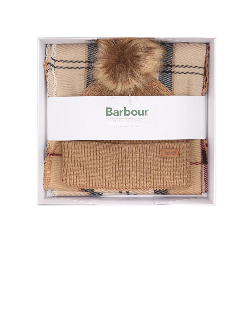 Set Regalo Donna firmato Barbour composto da un comodo cappello, realizzato in maglia a tinta uita, con pompon di pelliccia sintetica in tono colore e risvolto sul fondo. Completa il set la sciarpa in misto viscosa, con iconico motivo tartan e bordi sfrangiati.